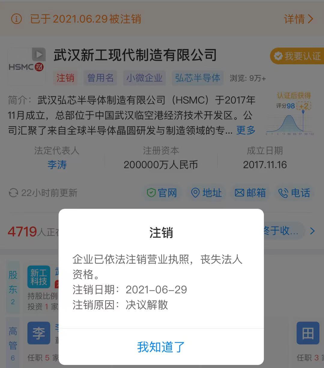 经过更名、高层换血、股权变更等一系列令人眼花缭乱的操作后,武汉弘芯突然于今年6月29日注销营业执照,注销原因为“决议解散”。